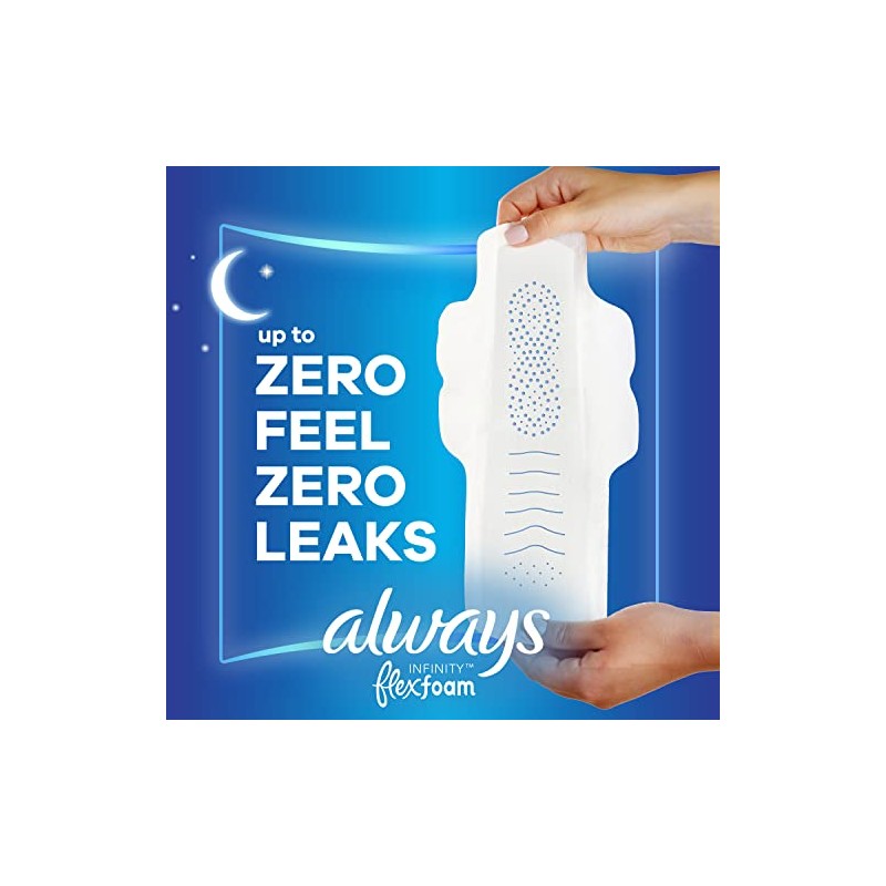 Celebrate leak-free nights with ALWAYS Infinity Size 4 Overnight Sanitary Pads with Wings. These super-absorbent pads have a wider back and are extra thin and flexible for Zero Feel protection so you can dream on, worry free. They make a great compliment to your favorite daytime pad. ALWAYS Infinity Sanitary Pads are made with FlexFoam technology, resulting in a breathable pad that is both thin and flexible without compromising on protection. Form-fitting grooves move with you while you sleep, twisting any which way, and conform to your unique shape, while a 50% longer back vs. Always Infinity Size 1 Regular protects you where you need it most. Unbelievable moisture-wicking technology pulls wetness away from your skin, keeping you clean and fresh all-night long, no matter how heavy your period is. With up to 12 hours of overnight leak-free protection, ALWAYS Infinity Size 4 Overnight Sanitary Pads provide outstanding security that you can barely feel, changing the way you experience your period while you sleep. Also try ALWAYS Infinity Size 5 Extra Heavy Overnight Sanitary Pads with Wings, for ALWAYS’ longest and best night-time protection.