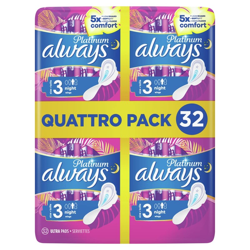 - This product contains: 1 x Always Platinum Night Protect Sanitary Pads with Wings - 32 Pieces