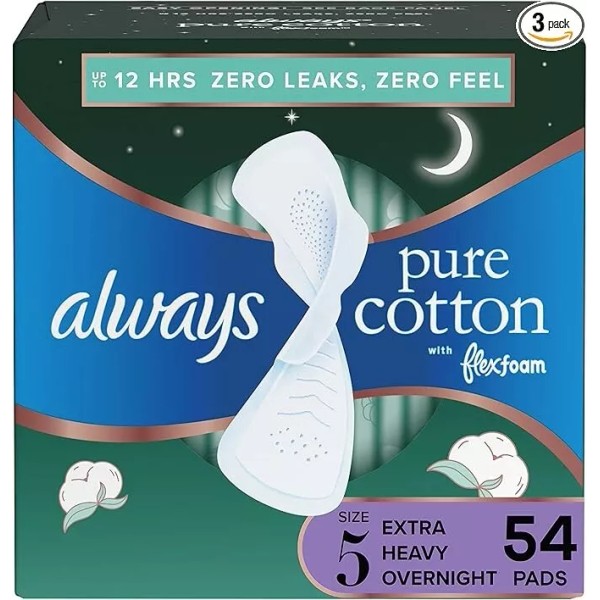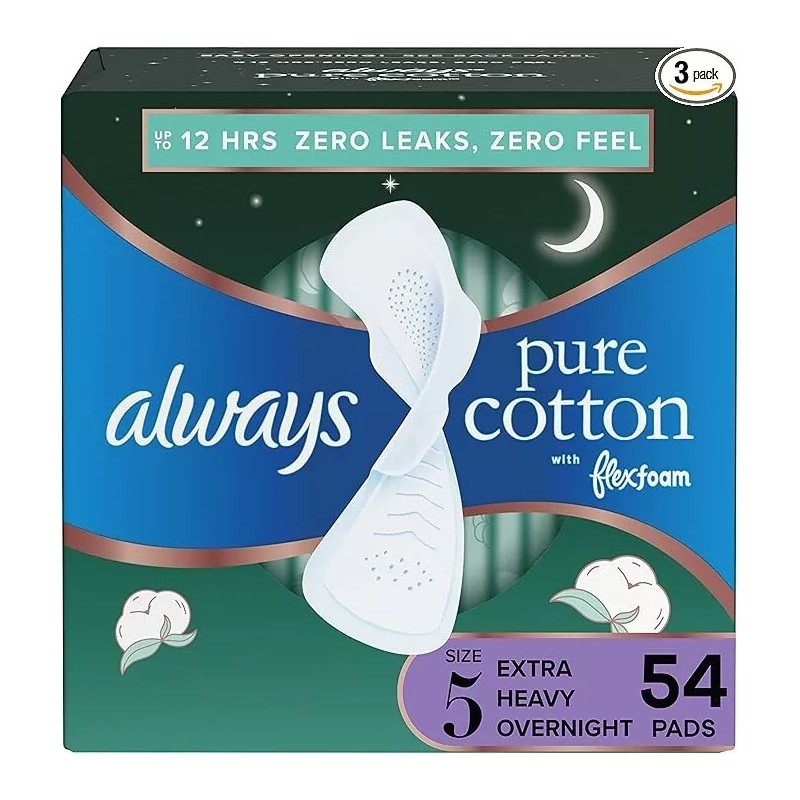 Always Pure Cotton Pads, Size 5 Extra Heavy Overnight, Unscented, 54 Count