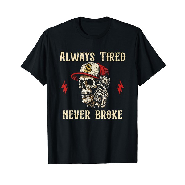 - Always Tired Never Broke ,Show off your undying hustle with this eye-catching design featuring a humorous skull, perfect for entrepreneurs, hard workers, and anyone who's always on the move but keeps their spirits high.