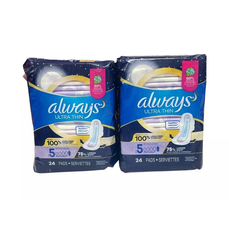 Always Ultra Thin Pads. Extra Heavy Overnight. Size 5. 24 Pads each -2 Pack