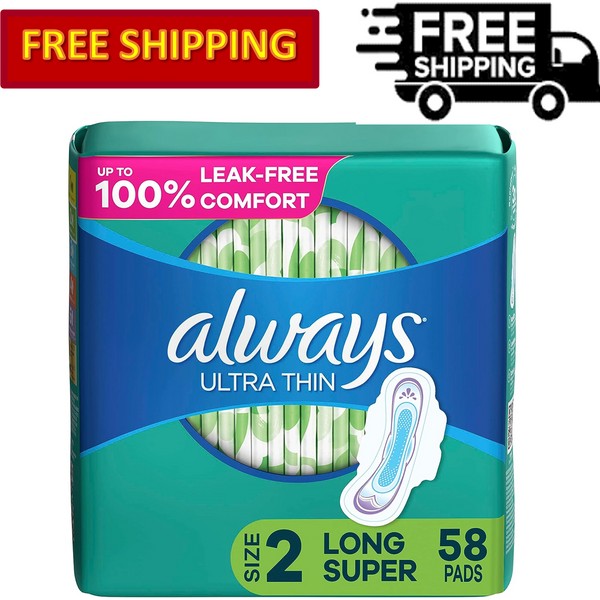 Always Ultra Thin Pads Unscented with Wings, Size 2 Long Absorbency, 58 Count