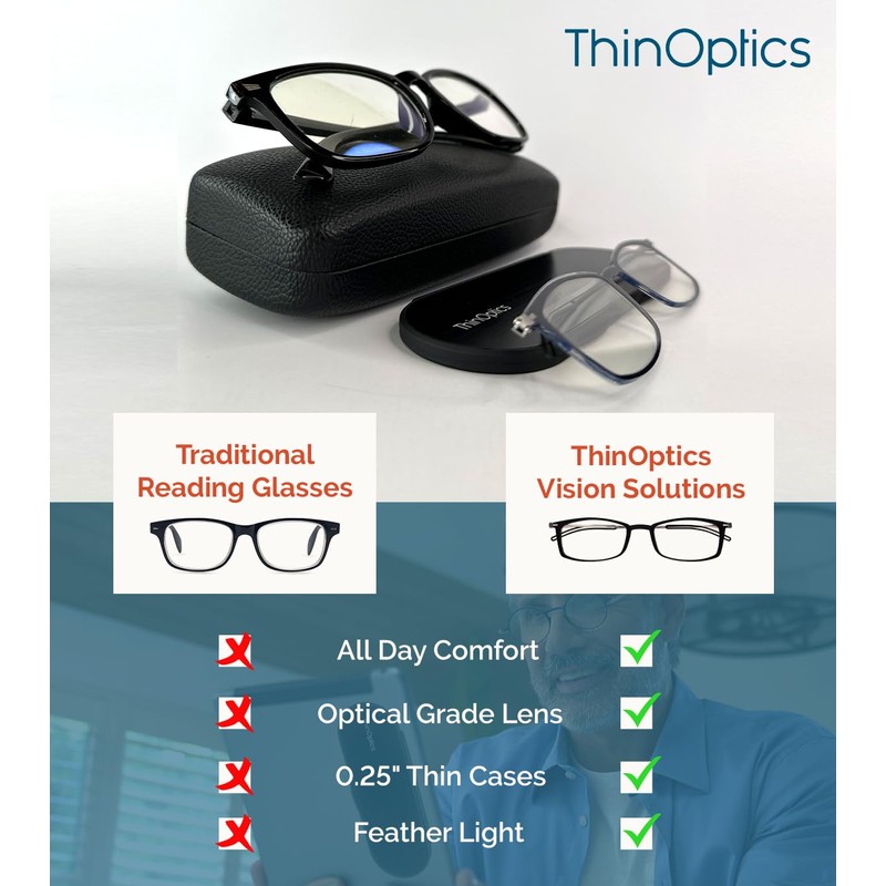 - ULTIMATE PORTABILITY & ACCESSIBILITY: Say goodbye to the frustration of misplaced reading glasses. With our ThinOptics readers, which feature the world’s thinnest readers with our portable slim glasses case, you have a versatile vision solution that travels anywhere. The easy-to-carry compact case fits in your pocket or purse for vision assistance that goes wherever you do.