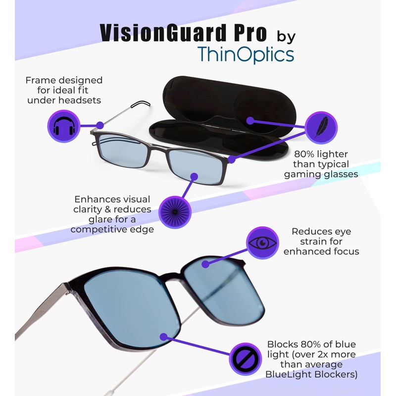 - PATENTED ULTRA-SLIM DESIGN: VisionGuard Pro by ThinOptics introduces a cutting-edge, featherlight design that sets a new standard in gaming eyewear, ensuring comfort during marathon gaming sessions. Designed to fit securely and comfortably with gaming headsets.