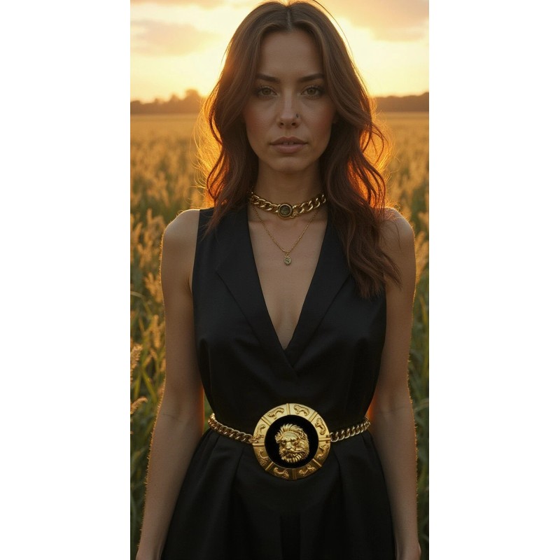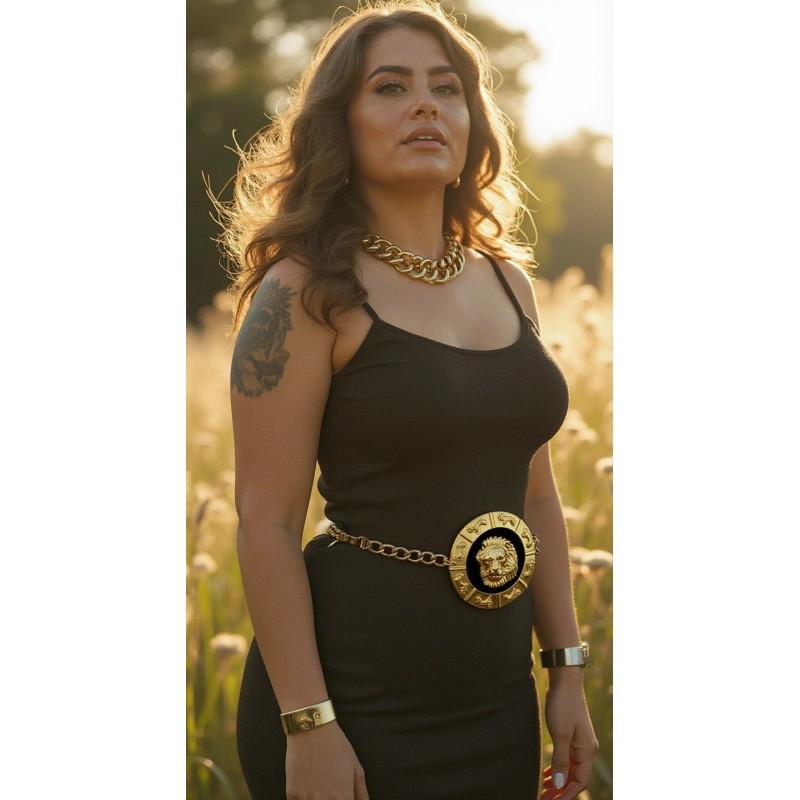 Hashtags:#LionBelt #HeavyMetalBelt #GoldStatementBelt #UrbanGlam #NightclubFashion #BoldAccessories #DesignerInspired #PhotoshootFashion #HipBelt #FierceLook #RunwayStyle #TrendyFashionBelt #AlwaysStyle4You