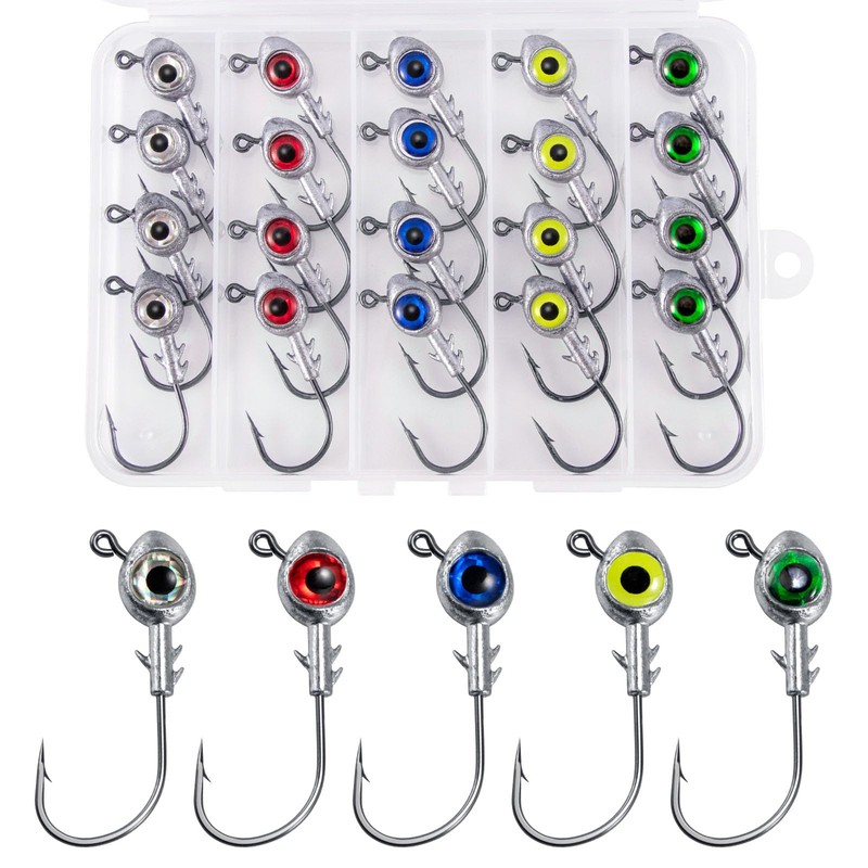 - PACKAGE INCLUDES: 20-Pack Oversize 3D eye fishing Jig Heads packed in box. Size: 3/16oz, 1/4oz, 3/8oz, 1/2oz. 5 different color eyes: Green, White, Red, Blue, Chartreuse.