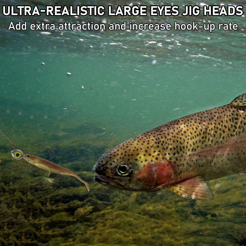 - PACKAGE INCLUDES: 20-Pack Oversize 3D eye fishing Jig Heads packed in box. Size: 3/16oz, 1/4oz, 3/8oz, 1/2oz. 5 different color eyes: Green, White, Red, Blue, Chartreuse.