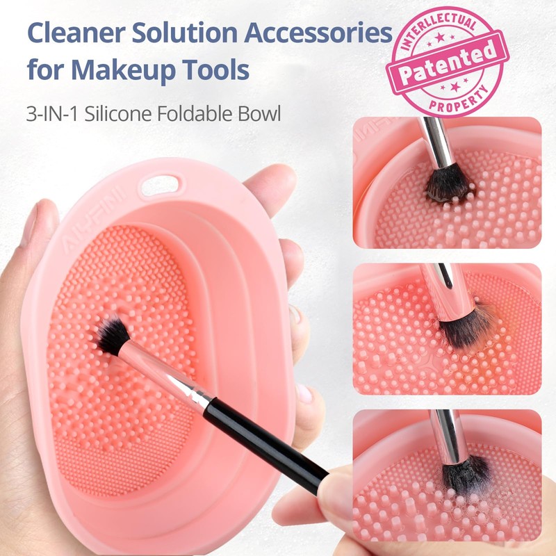 - Innovative Foldable Wash Basin for Makeup Accessories: The included 3-IN-1 foldable silicone makeup brush cleaner bowl features three distinct cleaning zones to cater to all brush types, from delicate eyeshadow brush to large foundation brush and lip brush. The makeup brush cleaner mat varying silicone pillar heights ensure optimal scrubber, penetrating deep into bristles to effectively remove makeup residue without damaging the bristles. The raised, diagonal grooves help spread dense bristles apart for a deeper clean, while rounded edges prevent bristle pulling