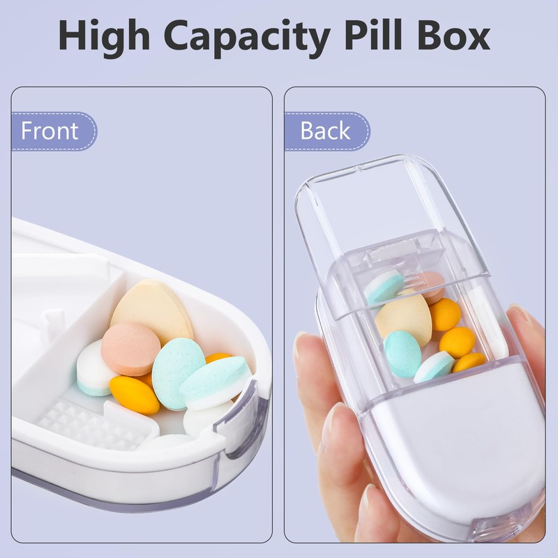 - [Auto Slides Out Pill Design] Our pill splitter for tablets designed with grooves that lets pills slide out easily after cutting, without needing to reopen the lid. This convenient, hygienic feature ensures quick access and makes pill cutting more efficient and hassle-free