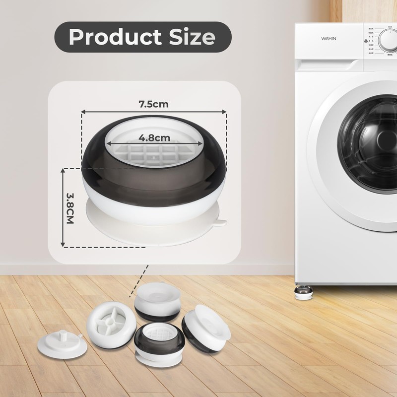 - Anti-Vibration & Noise Reduction: Washing machine feet feature a suction cup design at the bottom, enhancing friction and stability by creating a negative pressure suction to the ground. This prevents appliance shaking and ensures a quieter and smoother operation.
