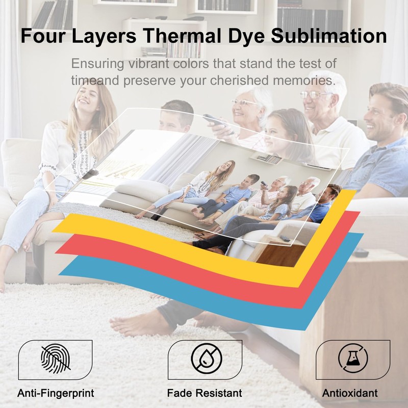 - [Anti-Fingerprint and Easy to Cut] Photo paper comes in the most popular 4 x 6 size. With cut-out areas on both sides, your fingerprints will not be left on the print area when refilling the photo paper. In addition, you can easily tear off both sizes of photo paper without damaging the image!High-Quality Photo Effect: With dye sublimation technology, it is waterproof, fingerprint-resistant and fade-resistant, which allows you to print photos with extraordinary colors and preserve them for a long time.