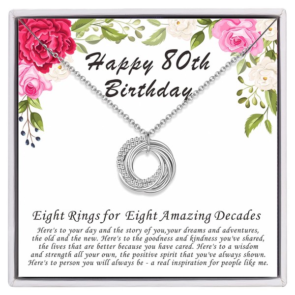 - 🎁80th Birthday Gifts for Women The necklace featuring three ring pendants. It makes the perfect 80th birthday gifts. A ring for each amazing decade.The silver necklace comes presented in an elegant gift box with a happy 80th birthday backing card. Help her celebrate the Big 80 with this simple, elegant gift. When she wears this beautiful necklace of three lovely silver circles, she'll have a reminder that your admiration is infinite.