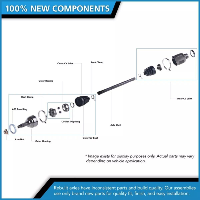 Our CV axle assemblies are brand new and direct replacements for the original factory parts.