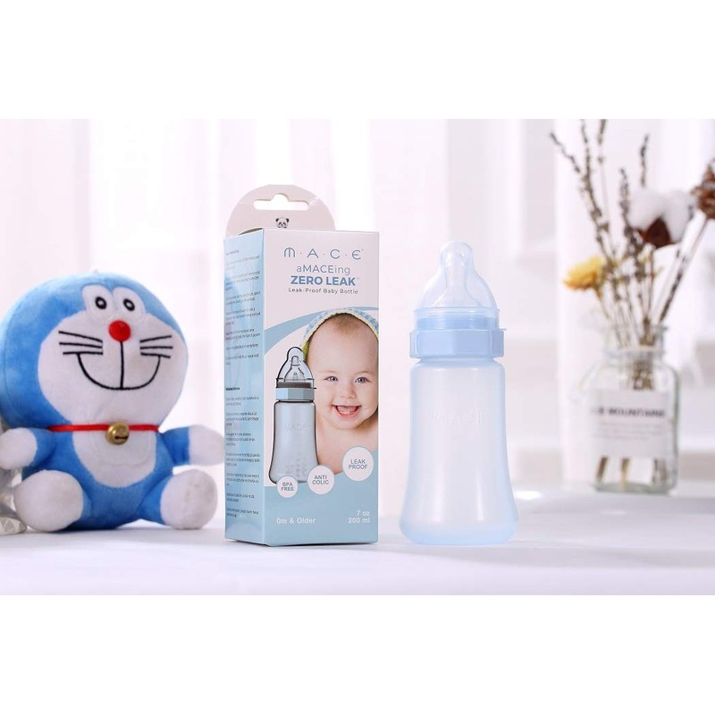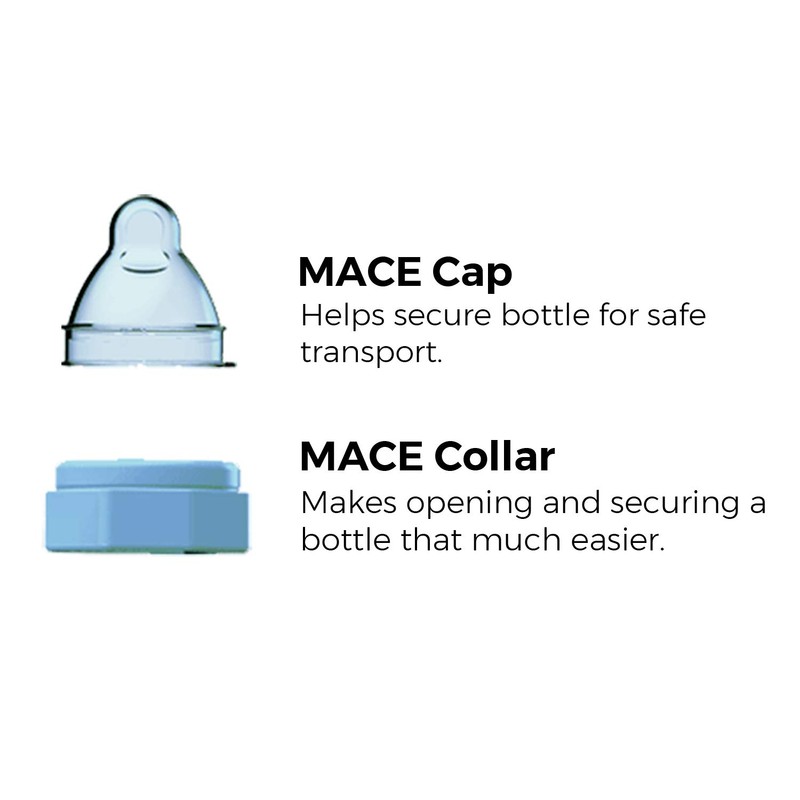 The aMACEing ZERO LEAK Baby Bottle uses a patented nipple design to offer a truly leak proof baby bottle. **Milk only comes out when your baby is feeding on the nipple. If your baby stops, the flow stops! This helps reduce the chances of health-related and potentially life-threatening risks.** Our nipple also has a uniquely designed **_anti-colic vent_** which helps reduce colic and symptoms like burping, gas, and reflux to make sure feeding is always a great experience for both you and your baby. In addition to leak proof and anti-colic, the nipple also features a variable flow which keeps your baby in control! Our nipple design adjusts to your baby's rhythm allowing milk to flow at his/her pace. This single nipple will work well for your little one whether he/she is just born or 6 months old, just a little less to worry about. Our Bottles are **BPA, lead, and phthalate free** to ensure your peace of mind. When handling the Mace baby bottle, the patented collar makes opening and securing the baby bottle easier while the Mace bottle cap secures the bottle for safe transport. Our baby bottles feature a wide base, (2-5/8"), to help prevent the bottle from easily tipping over. Mace baby bottles come in 7 ounce. and 10 ounce sizes and feature both ml and oz measurement marks on the bottle. aMACEing ZERO LEAK Baby Bottle is safe to go in the top rack of your dishwasher. It is recommended that you wash all parts separately. aMACEing ZERO LEAK Baby Bottles have passed CA Prop 65, CPSC, FDA, and SGS testing. The packaging for our product has had two different versions: an old one (with the “1-6mo” age advisory), and an updated (made correction) one (“0m and older” age advisory). The stock we have in fulfillment centers may make up of bottles in both kinds of boxes, and which box our customers receive are at random orders. We just want to clarify the product is the 100% the same, regardless of packaging.