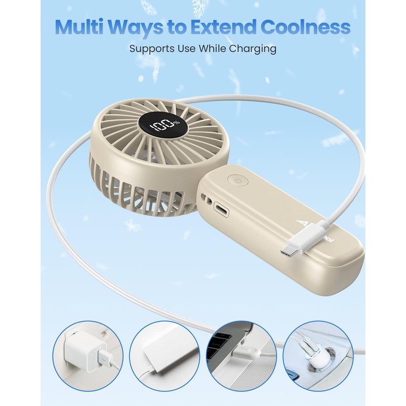 - Handheld/Desk/Neck Fan: With its multi-functional design, you can grab it as a handheld fan during commuting and hiking, place it on a table for a refreshing breeze from any angle while working, doing makeup, or relaxing outdoors. You can also wear it around your neck with the lanyard for hands-free cooling and easy portability