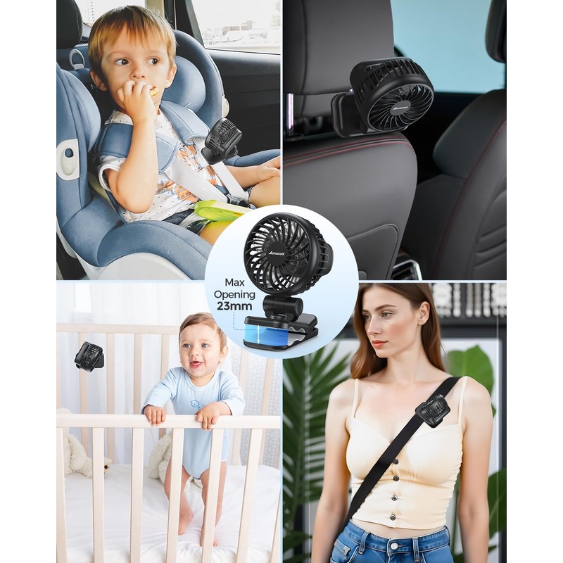 AMACOOL Mini Stroller Fan with Clip for Baby Carrier/Car Seat/Bassinet, 3-Speed Portable Fan, 10H Cooling Rechargeable, Ultra Light 0.24 lb, Safe Gaps, 360° Rotatable for Diaper Backpack Desk Travel