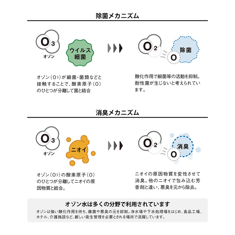 • Ozone water has a high disinfecting and deodorizing effect, but it has many of its excellent features including hand skin-friendly, low residue, and high safety