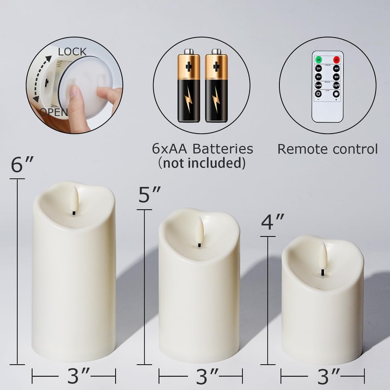 - Package Include: This Candle Set include 3 outdoor flickering candles(D3"x H4"5"6"), 1x remote control, 1x user manual. Each candle is powered by 2 AA batteries(500+ hours with high-grade batteries). All these candles have been tested strictly.
