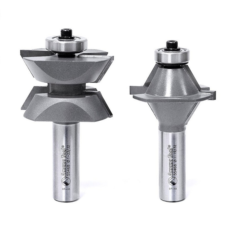 Since 1972, Amana Tool has been producing router bits and has become the global leader in its field. In fact, the company was the first manufacturer to produce router bits according to the Holz BG German standard for safety and quality. This standard contains rules that determine the structure and quality of the tool's material in order to create the safest environment for the user. From its beginning, Amana Tool has always used the highest quality materials, and its tools are produced using unique technologies, a majority of which were developed and built by the company's engineers following decades of testing and experience. For example, Amana Tool uses carbon alloy steel for its router bits that contains vanadium particles. This improves the structural integrity of the steel and prevents corrosion and defects in the internal structure of the material that can lead to cracks and breaks. High-tech machinery processes the carbon alloy steel to manufacture the router bodies in a single clamping. This yields router bits with superior balance, centricity, precision and symmetry. This two-piece bit set provides an economical way to create your own edge banding from the wood of your choice. This is a great way to create a finished edge on plywood or MDF panels and shelves which blends perfectly with the rest of your project. Using this bit set is simple, too. Just position each bit so that it is centered on the stock thickness and make the cut. For the best results we recommend that you cut the edge band stock slightly oversize and then flush trim it after assembly. The 60 degree set creates a larger surface area for glue. Carbide tipped for long life.