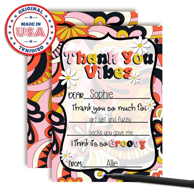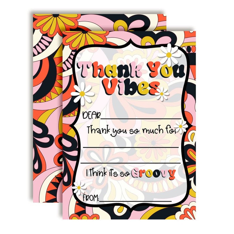Amanda Creation Groovy Birthday Vibes Birthday Party Thank You Notes, Ten 4" x 5.5" Fill-In the Blank Cards with 10 White Envelopes