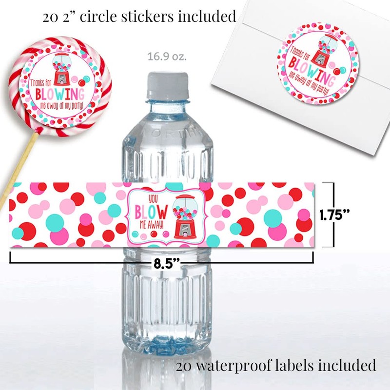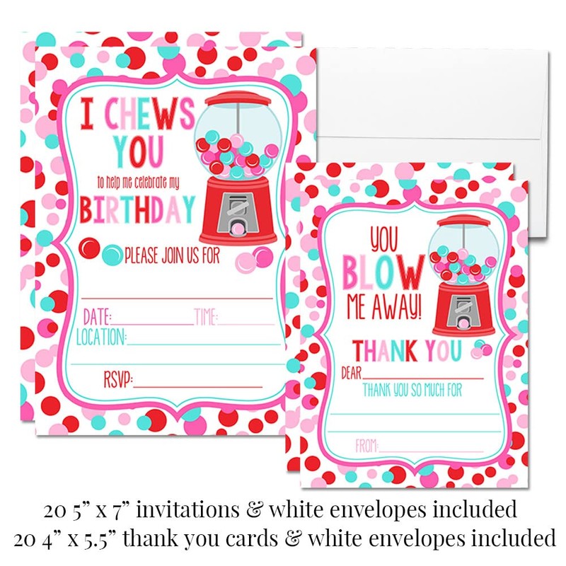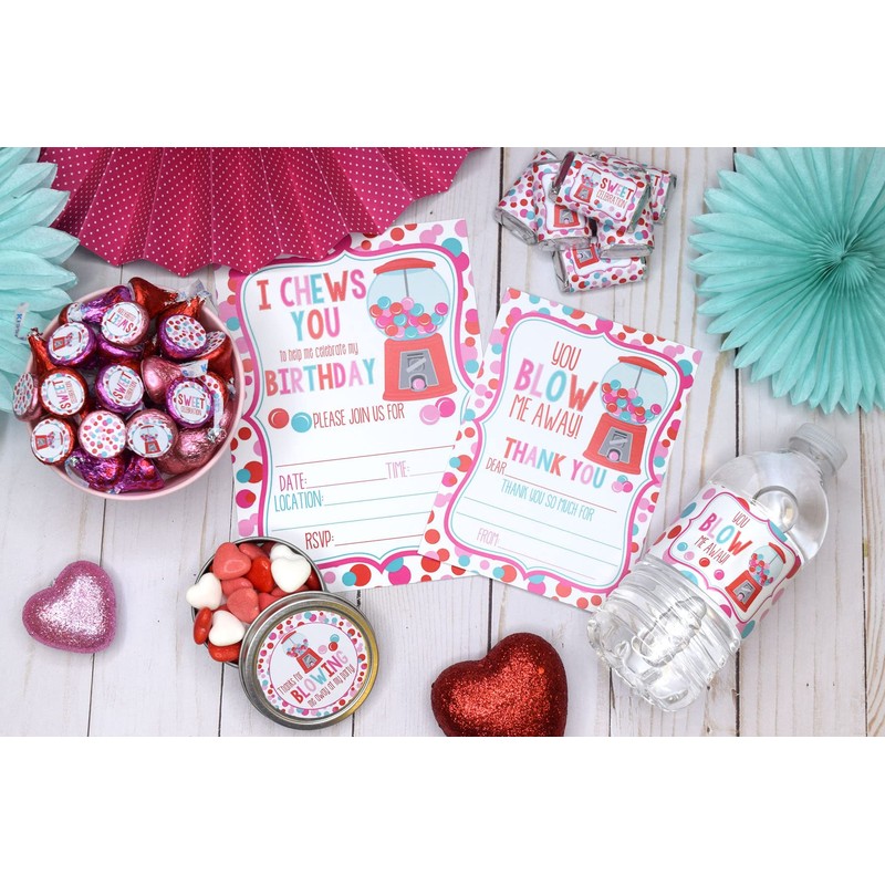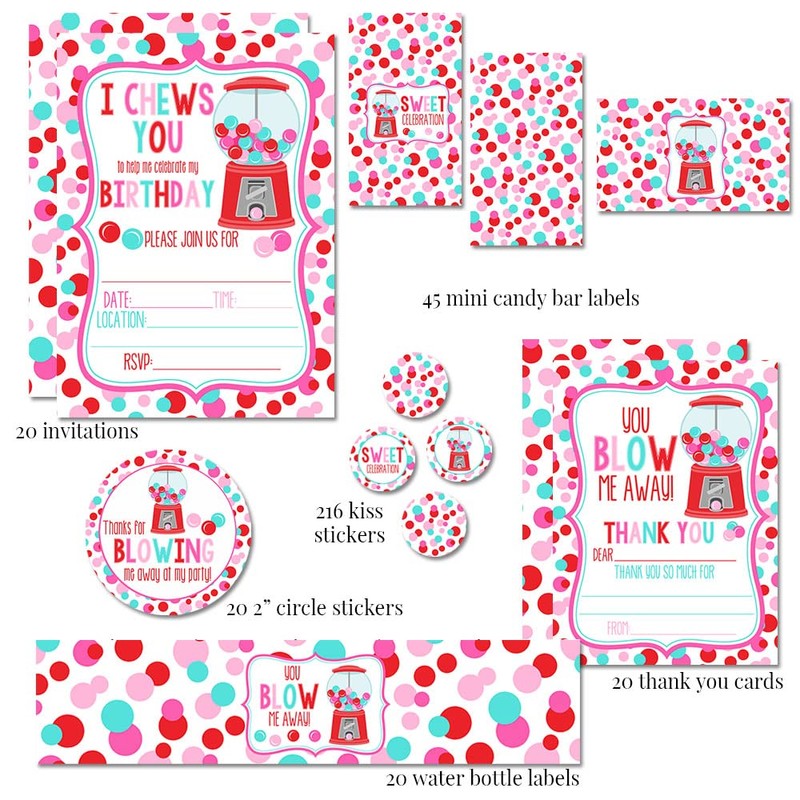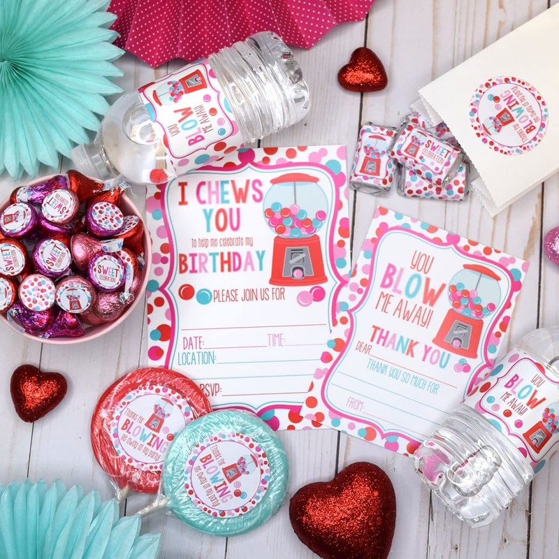 Amanda Creation Super Deluxe Pastel Bubble Gum Valentine's Day Birthday Party Bundle, Includes 20 Invitations & Thank You Cards & Envelopes plus Stickers and Water Bottle Labels!