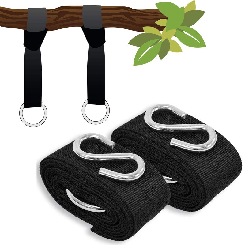 - Mounting set for indoor and outdoor use – set of 2 swing suspension with strap in black – indoor and outdoor. Each tree attachment approx. 320 x 5 cm, with 2 steel hangers. Plus: storage bag.