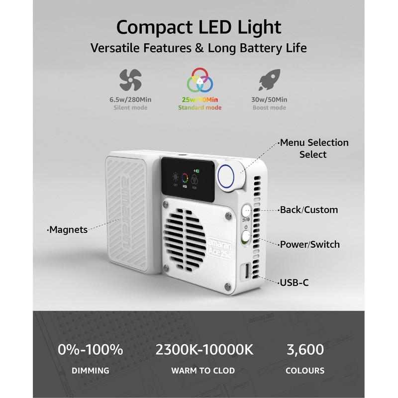 The amaran Ace 25c is a full color compact LED light with up to 32W of power output2 designed for on-the-go creators seeking limitless color control for any situation. Featuring the amaran Ace Lock quick-release mount and double the brightness, battery life, and charging speed of other comparable pocket-sized lights, the amaran Ace 25c is a brilliantly bright yet compact light ready to make your content shine with the perfect shade.