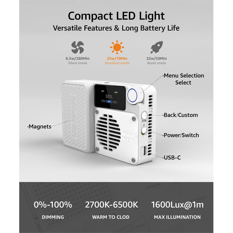 - Powerful & Compact On-Camera Light - The amaran Ace 25x offers up to 32W bi-colour LED power with a boost mode for extra brightness. Perfect for creative users on the go, it delivers 6,320 lux at 0.5 m (5,600K) in a handy design, ideal for content creation in any environment.