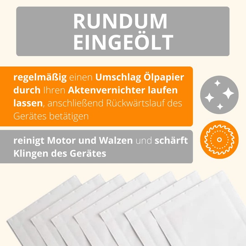 - Quantity - The oil paper shredder is available in packs of 10, 15 and 30. The perfectly dosed care product with vegetable lubricants lubricates and cleans the engine, rollers and sharpens the blades of the device.