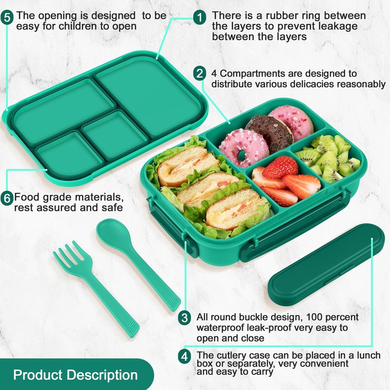 Amathley Brotdose Kinder Mit FäChern,Bento Box Kinder,Brotdose Erwachsene,1200ml Lunchbox Mit 4 FäChern Und Besteck,Mikrowellen Und SpüLmaschinenfest,BPA-Frei Und Wiederverwendbar (Grün)