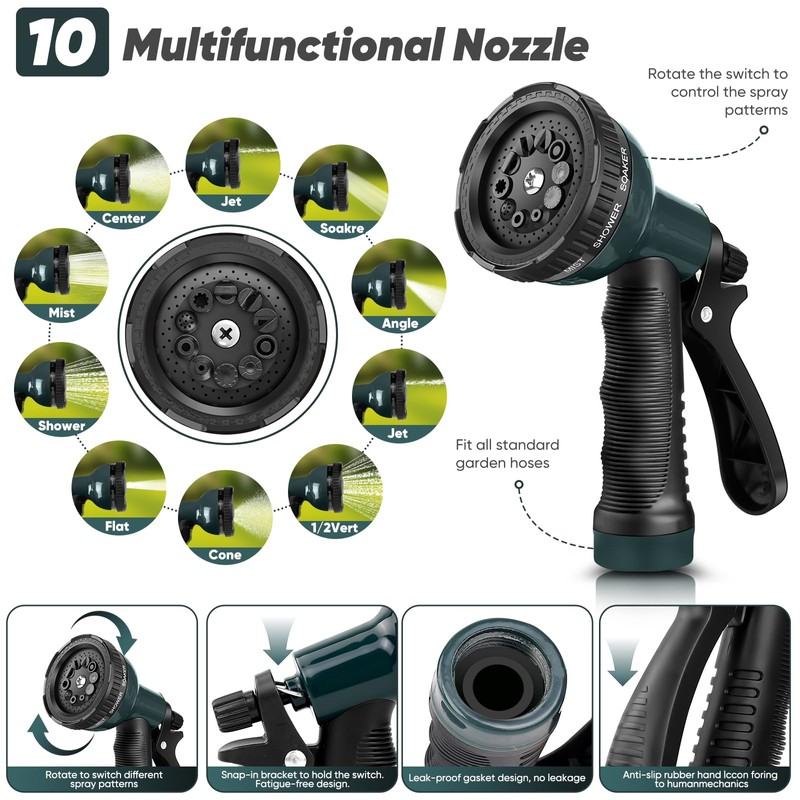 - 10-Function Nozzle, No Fatigue for Use in Multiple Scenarios: Our stainless steel garden hose, in addition to normal garden maintenance, can also meet your more use scenarios such as Car Washing, pet shower, Patio cleaning, RV, etc. The multi-functional nozzle is made of non-slip material and its shape is ergonomically designed to provide you with an easy use experience. Fatigue-free design, you put down the triangular metal on the nozzle when using it, and you can use it effortlessly.