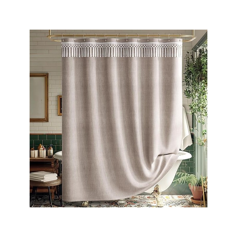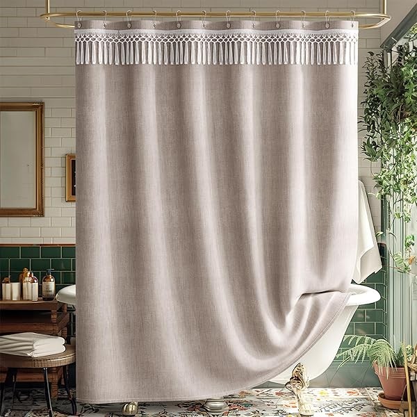 AmazerBath Boho Farmhouse Shower Curtain with Tassels, Faux Linen Fabric, Neutral, Water Repellent, 72x72 Inches