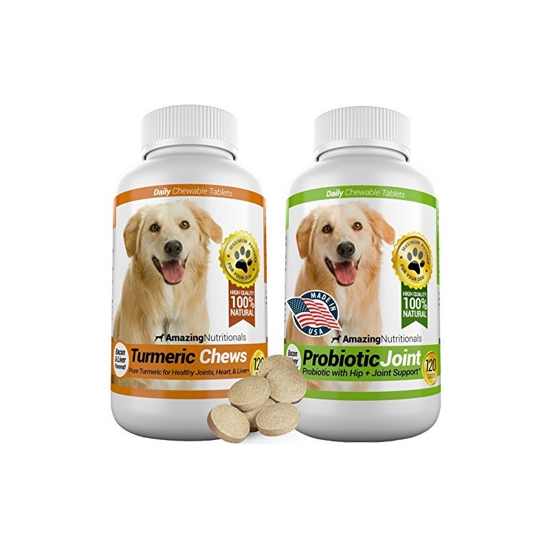 Amazing Dog Turmeric Plus Probiotic Joint for Dogs Combo Pack - Dogs Love the Taste! Get the only complete Turmeric and Probiotic chewable tablets for dogs. Turmeric Chews for Dogs by Amazing Nutritionals is the only great-tasting dog supplement that treats coat and skin conditions, itchy skin, flaking, and hot spots while protecting your dog's heart, immune system, and joints. Probiotic Joint for Dogs is the only dog supplement that treats digestive conditions like diarrhea and constipation with L.acidophilus and pancreatic digestive enzymes AND arthritis with joint pain relief using the safe, proven supplements glucosamine, MSM, and chondroitin. Together it's a powerful way to achieve total dog health... and it's the only one on the market! Get optimum skin and coat health and increased joint mobility, both of which are important as your dog ages. Helps ease diarrhea, flatulence/gas, constipation, intestinal infections. PLUS... your dog will absolutely LOVE these tasty bacon and liver flavored chewable tablets. Achieves total dog health and restores your dog's natural balance with a complete probiotic for dogs. Optimal Heart, Immune System, and Hip and Joint Support - Safe and proven for relieving joint pains and targets arthritis for hip joint pain relief. Powerful antioxidant helps reduce inflammation and discomfort. Veterinarian recommended, totally safe as a daily supplement. Contains no fish, shrimp, crab, shark, or avocado - won't hurt your pet - Made in the USA, GMP organic certified facility and 3rd party tested for purity - no refrigeration required - bacon and liver flavored chewable tablets your pet will love - money-back 30-day guarantee. Combine with Omega 3 for maximum effectiveness. See massive improvement in your dog's condition within 30 days or we will give you a complete refund! Don't wait... scroll back up and click the button at the top of this page to help your dog feel better now!