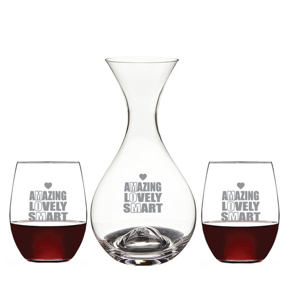 Amazing Lovely Smart Mom Deep Etched Wine Decanter and 15-ounce Stemless Wine Glass (Set of 3)