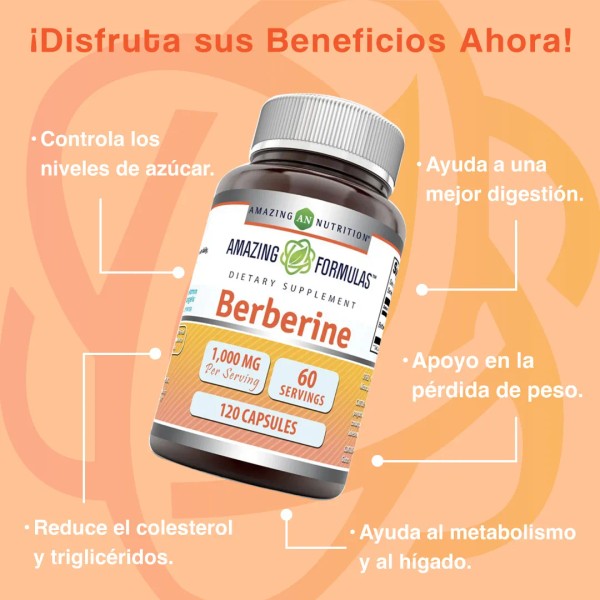 Amazing Nutrition Amazing Formulas Berberina 1000mg 120 Cápsulas Suplemento Control De Azúcar En La Sangre Apoyo Cardiovascular Mejora La Salud Intestinal y Antioxidante Natural
