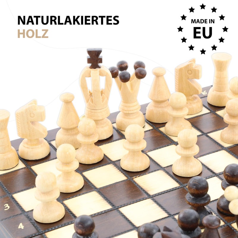 • Environmentally friendly: robust, solid wood chess board an ecological alternative to other plastic games. Top quality, hand-crafted in Europe with attention to detail, even the chess figures are hand-carved. The board is foldable, it serves as a box for storing the figures.