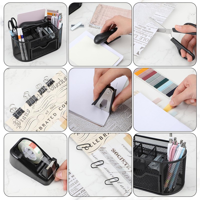 - Package List: you will get a set of exquisite black office supplies, including 1 mesh desk organizer, 1 stapler, 1000pcs 26/6 staples, 1 staple remover, 1 Scissors, 1 tape holder, 30 clips, 7 large binder clips, 15 small binder clips, and 20 thumbtacks