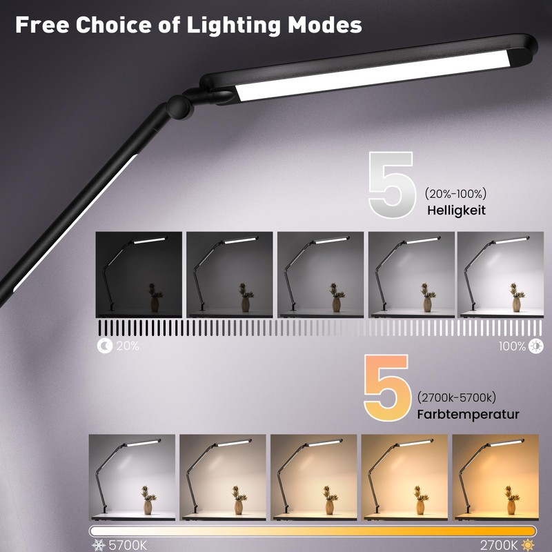 - 【5 Brightness Levels & 5 Color Temperature】 - Flicker-free and glare-free illumination covers your entire desk area. 5 Brightness Levels & 5 Color Temperature (Long press, steplessly adjust the brightness or color temperature).Warm light could make people relaxing and comfortable, cool light make people more focused and work efficiently