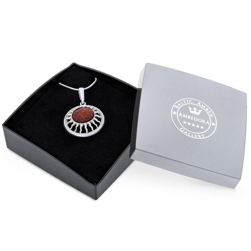 AMBEDORA Women's Japanese Sun Necklace, Polished Sterling Silver, Baltic Amber in Cognac Colour, Silver Pendant with Chain