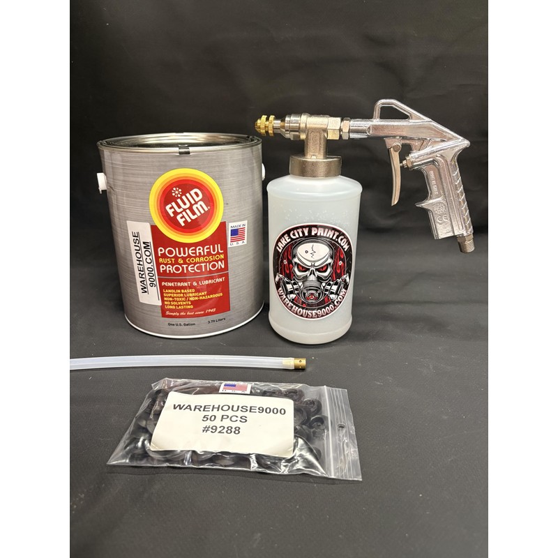 Amber FF Lanolin Undercoating Fluid Gallon, Pro Undercoating Gun, 360* Wand, 1 Empty Quart Bottle, and 50 Rust Plugs
