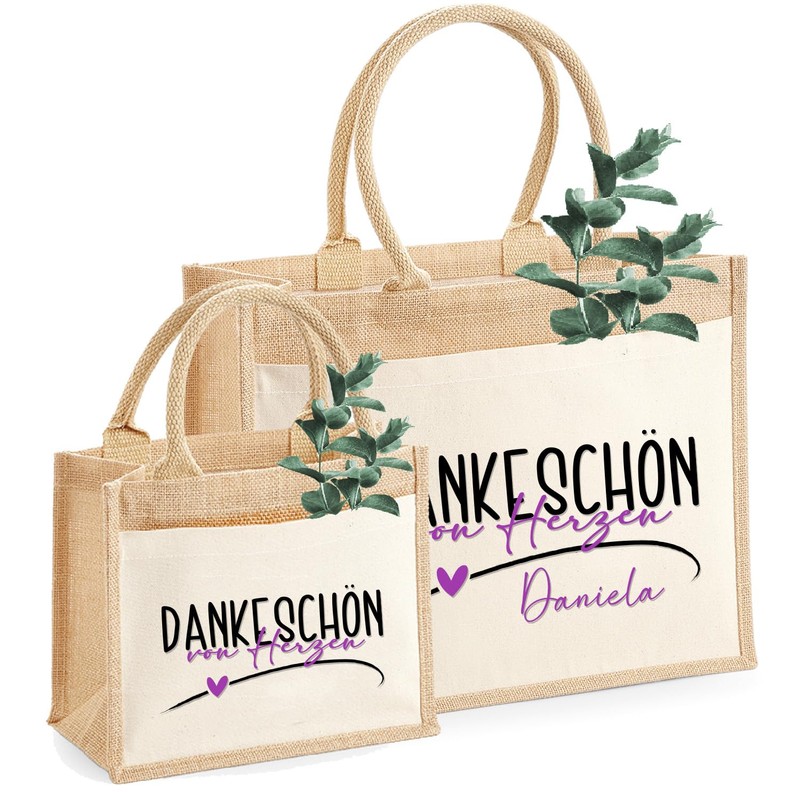 AMBERGER DESIGN by A&M Osterhage amd Jute-Tasche klein Dankeschön von Herzen mit Wunschname personalisiert | Geschenk-Tasche in Größe S oder M | Nachhaltiger Jutebeutel