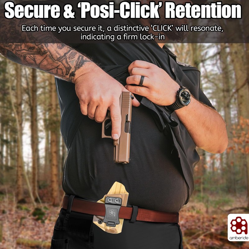 - Discreet, Secure & ‘Posi-Click’ Retention: Holster your weapon seamlessly and confidently. Each time you secure it, a distinctive ‘CLICK’ will resonate, indicating a firm lock-in. Beyond just holding your firearm, it provides comprehensive trigger coverage against accidental discharges, paired with polished edges and a sleek interior to protect your firearm from scratches.