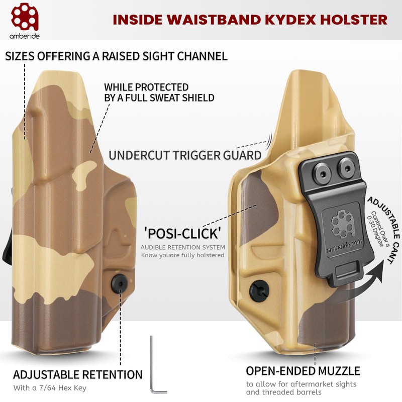 - Adaptable Design & Faster Draw: Amberide OWB paddle holster fits belts up to 1.5'' wide seamlessly. With its secure hook, it ensures solid stability during faster draw and retention. Enhanced by a flexible detachable clip system for versatile angle adjustments, whether it's appendix, strong side, behind-the-hip, or cross-draw. The holster tightness can also be adjusted using the Hex Key in the accessory.