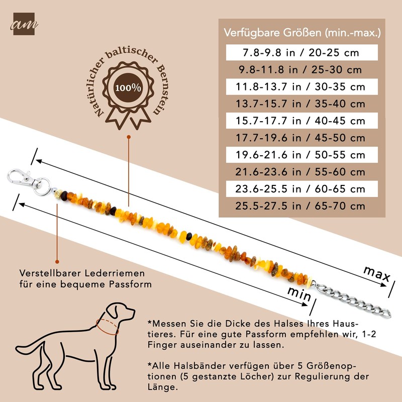 - Amber chain for dogs – Our collar for dogs is handmade from genuine Baltic amber and comes without chemicals. Each bead is individually knotted, which prevents scattering in the event of breakage. The adjustable leather strap is easy to clean and dries quickly, allowing stylish appearance and easy care.