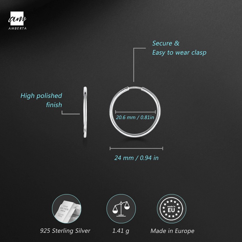 - Hoop earrings dimensions – the silver hoop earrings are light and comfortable to wear. Weight: 1.41 g. Ring outer diameter: 20.6 mm. Ring thickness: 1.5 mm. Perfect for everyday use or to accompany you on special occasions.