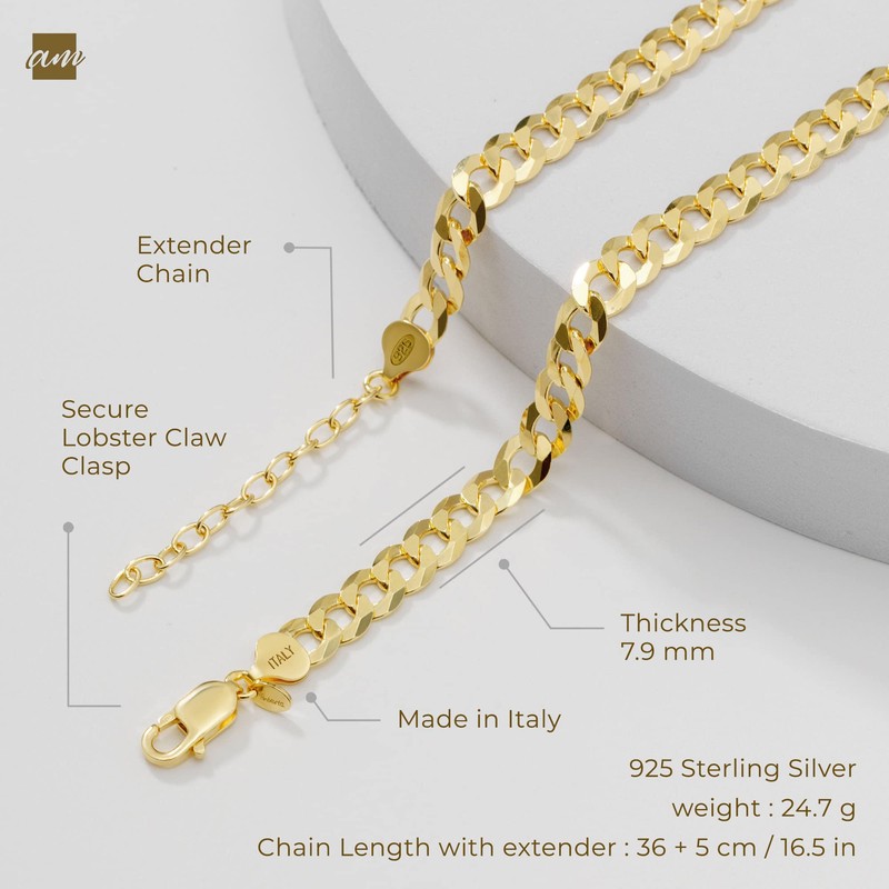 - Men's curb chain dimensions – Our Cuban chain necklace is easily adjustable and can be combined with other men's curb chains. A perfect necklace to layer or wear on its own. This curb necklace offers a comfortable and pleasant wearing experience. Width: 7.9mm Weight: 24.7 g. Length: 41 cm + 5 cm (extension).