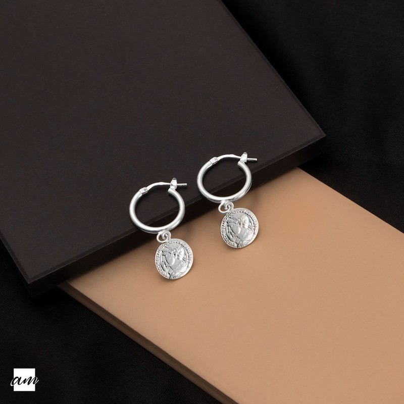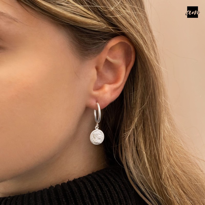 - Coin hoop earrings – enrich your look with this timeless pair of silver hoop earrings for women. These small hoop earrings are decorated with a beautiful, detailed Roman coin pendant and add just the right amount of glamour to your look. Our elegant yet eye-catching silver hoop earrings with charm are the perfect accessory for casual wear or to accompany you on a special occasion.