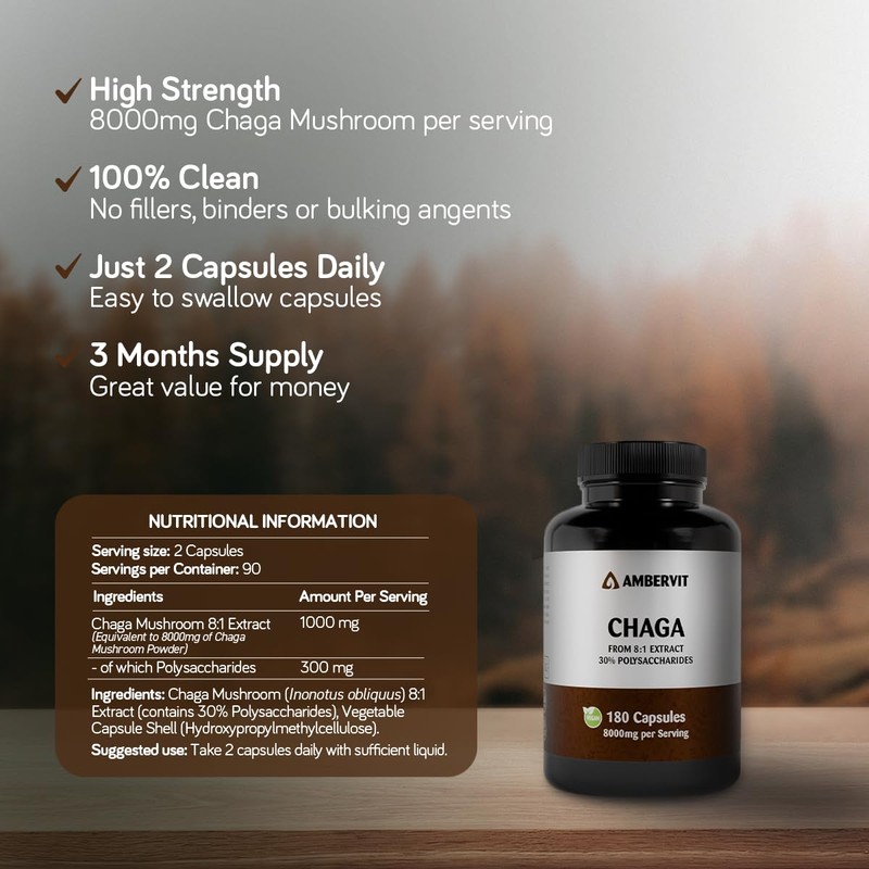 Product descriptionAmbervit Chaga Mushroom Capsules C 180 Capsules C High-Strength Extract with 30% Bioactive Polysaccharides EXCELLENT VALUE & HIGH STRENGTHEach bottle contains 180 Chaga mushroom capsules, providing a 3-month supply. A daily serving of 2 capsules delivers 8,000mg of Chaga mushroom powder equivalent, ensuring long-term support for your well-being. PURE & FREE FROM ARTIFICIAL ADDITIVESOur Chaga supplement is made with pure Chaga mushroom extract in vegetable capsules, with no artificial fillers, binders, or unnecessary additives. HIGHLY BIOAVAILABLE & WELL-TOLERATEDFree from gluten, lactose, fructose, magnesium stearate, preservatives, soy, yeast, pesticides, fungicides, artificial fertilisers, colourants, stabilisers, and GMOs, making it ideal for vegans, vegetarians, and allergy sufferers. PREMIUM QUALITY & TESTED FOR PURITYOur Chaga mushroom extract is HPLC-tested to guarantee high active ingredient content. Produced in the EU under strict quality standards (GMP, ISO 9001, HACCP), ensuring safety, purity, and effectiveness.What is Chaga Mushroom?The Chaga mushroom (Inonotus obliquus) is one of the most important medicinal mushrooms, alongside Reishi, Lion's Mane, Hericium, Shiitake, Maitake, and Cordyceps. It has been used for centuries in traditional mycotherapy for its high polysaccharide and beta-glucan content.Why Choose Ambervit Chaga Mushroom Capsules?Our Chaga extract is sourced from wild-harvested Northern European birch trees and contains only the fruiting body, ensuring maximum potency. We use dual extraction (water & ethanol) to preserve all key bioactive compounds, including polysaccharides, beta-glucans, triterpenoids, melanin, polyphenols, and superoxide dismutase, providing a high-strength and effective Chaga supplement.IngredientsChaga Mushroom (Inonotus obliquus) 8:1 Extract (contais 30% Polysaccharides), Vegetable Capsule Shell (Hydroxypropylmethylcellulose)DirectionsTake 2 capsules daily with sufficient liquid