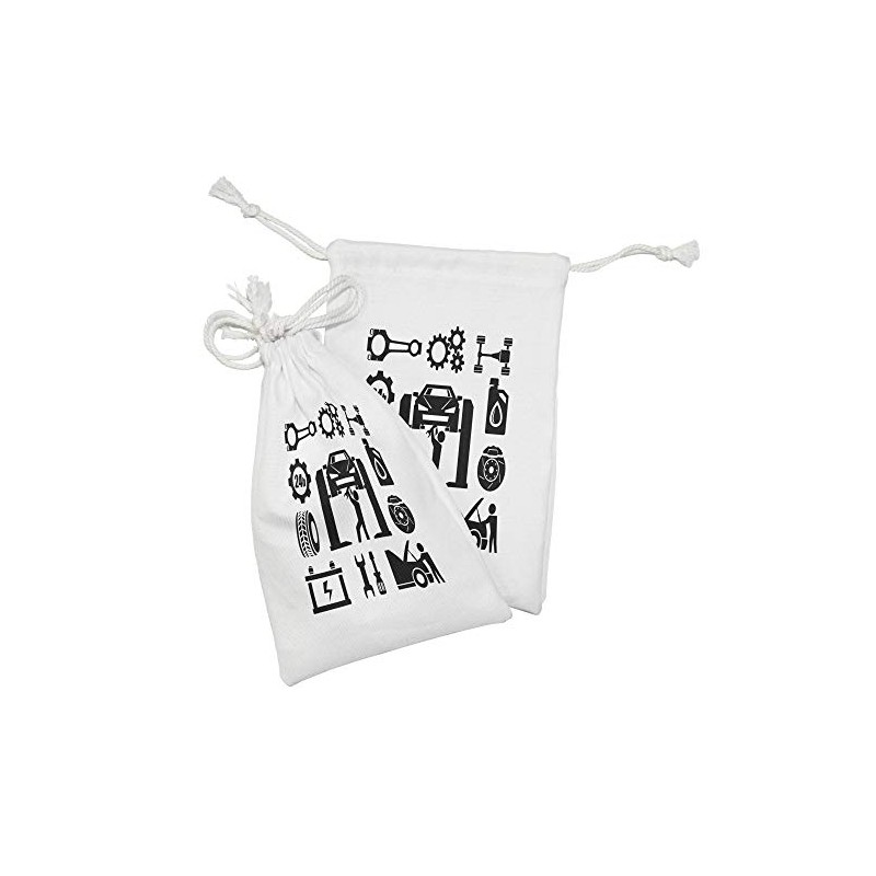Ambesonne Auto Mechanic Fabric Pouch Set of 2, Pictogram Style Repairing Themed Car and Mechanical Monochrome, Small Drawstring Bag for Toiletries Masks and Favors, 9" x 6", Charcoal Grey White