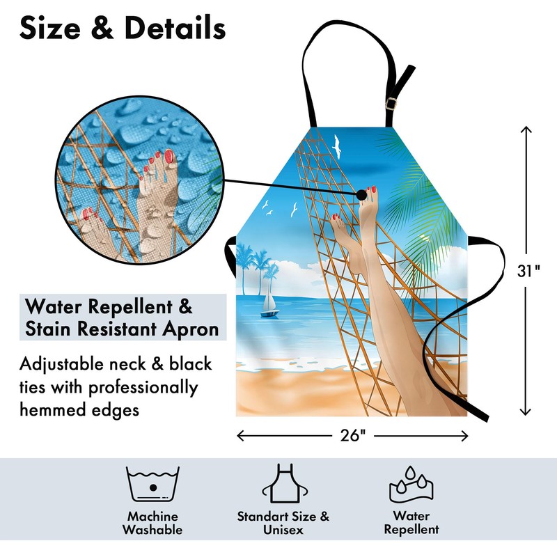 Ambesonne Beach Apron, Legs of the Lady Laying in the Hammock Toward the Ocean in Hawaiian Tropical, Unisex Kitchen Bib with Adjustable Neck for Cooking Gardening, Adult Size, Cream Blue